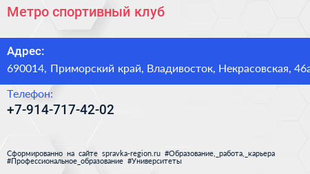 Метро, спортивный клуб по адресу 690014, Приморский край, Владивосток, Некрасовская, 46а в дальнейшем Организация, размещена в следующих категориях: