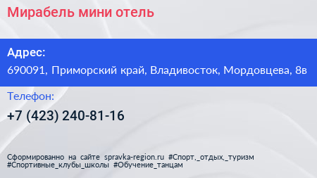 Мирабель, мини-отель по адресу 690091, Приморский край, Владивосток, Мордовцева, 8в в дальнейшем Организация, размещена в следующих категориях: