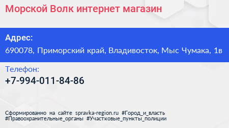 Морской Волк, интернет-магазин по адресу 690078, Приморский край, Владивосток, Мыс Чумака, 1в в дальнейшем Организация, размещена в следующих категориях:
