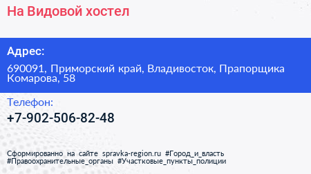 На Видовой, хостел по адресу 690091, Приморский край, Владивосток, Прапорщика Комарова, 58 в дальнейшем Организация, размещена в следующих категориях: