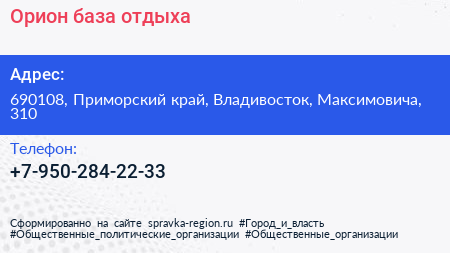 Орион, база отдыха по адресу 690108, Приморский край, Владивосток, Максимовича, 310 в дальнейшем Организация, размещена в следующих категориях:
