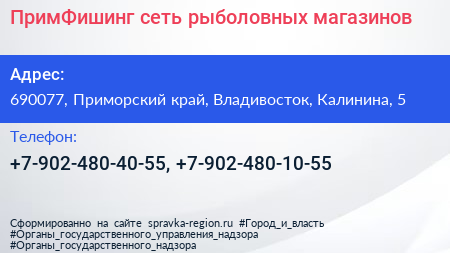 ПримФишинг, сеть рыболовных магазинов по адресу 690077, Приморский край, Владивосток, Калинина, 5 в дальнейшем Организация, размещена в следующих категориях: