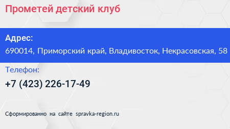 Прометей, детский клуб по адресу 690014, Приморский край, Владивосток, Некрасовская, 58 в дальнейшем Организация, размещена в следующих категориях:
