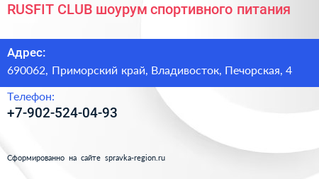 RUSFIT CLUB, шоурум спортивного питания по адресу 690062, Приморский край, Владивосток, Печорская, 4 в дальнейшем Организация, размещена в следующих категориях: