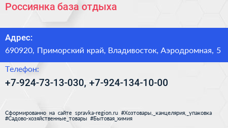 Россиянка, база отдыха по адресу 690920, Приморский край, Владивосток, Аэродромная, 5 в дальнейшем Организация, размещена в следующих категориях: