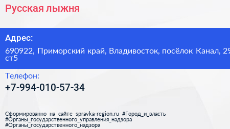 Русская лыжня по адресу 690922, Приморский край, Владивосток, посёлок Канал, 29 ст5 в дальнейшем Организация, размещена в следующих категориях: