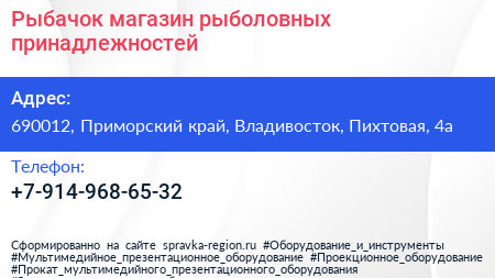 Рыбачок, магазин рыболовных принадлежностей по адресу 690012, Приморский край, Владивосток, Пихтовая, 4а в дальнейшем Организация, размещена в следующих категориях: