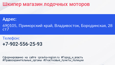 Шкипер, магазин лодочных моторов по адресу 690105, Приморский край, Владивосток, Бородинская, 28 ст7 в дальнейшем Организация, размещена в следующих категориях: