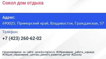 Сокол, дом отдыха по адресу 690025, Приморский край, Владивосток, Гражданская, 57 в дальнейшем Организация, размещена в следующих категориях: