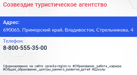 Созвездие, туристическое агентство по адресу 690065, Приморский край, Владивосток, Стрельникова, 4 в дальнейшем Организация, размещена в следующих категориях: