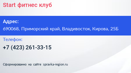 Start, фитнес-клуб по адресу 690068, Приморский край, Владивосток, Кирова, 25Б в дальнейшем Организация, размещена в следующих категориях: