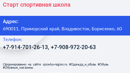 Старт, спортивная школа по адресу 690011, Приморский край, Владивосток, Борисенко, 60 в дальнейшем Организация, размещена в следующих категориях: