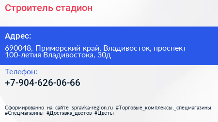 Строитель, стадион по адресу 690048, Приморский край, Владивосток, проспект 100-летия Владивостока, 30д в дальнейшем Организация, размещена в следующих категориях: