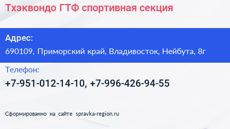 Тхэквондо ГТФ, спортивная секция по адресу 690109, Приморский край, Владивосток, Нейбута, 8г в дальнейшем Организация, размещена в следующих категориях: