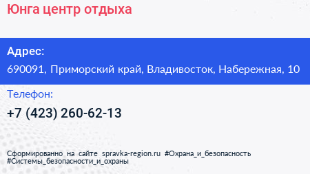 Юнга, центр отдыха по адресу 690091, Приморский край, Владивосток, Набережная, 10 в дальнейшем Организация, размещена в следующих категориях: