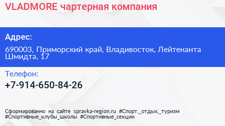 VLADMORE, чартерная компания по адресу 690003, Приморский край, Владивосток, Лейтенанта Шмидта, 17 в дальнейшем Организация, размещена в следующих категориях: