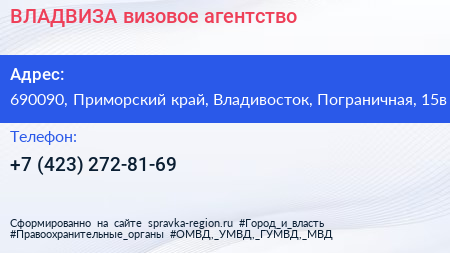 ВЛАДВИЗА, визовое агентство по адресу 690090, Приморский край, Владивосток, Пограничная, 15в в дальнейшем Организация, размещена в следующих категориях: