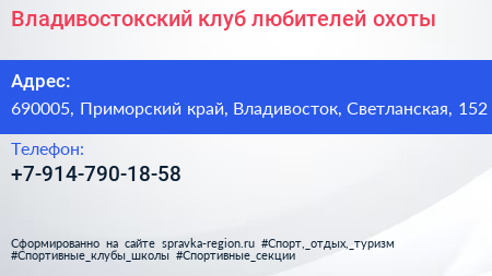 Владивостокский клуб любителей охоты по адресу 690005, Приморский край, Владивосток, Светланская, 152 в дальнейшем Организация, размещена в следующих категориях: