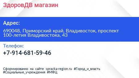 ЗдоровДВ, магазин по адресу 690048, Приморский край, Владивосток, проспект 100-летия Владивостока, 43 в дальнейшем Организация, размещена в следующих категориях: