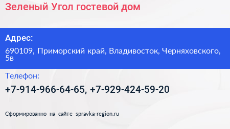 Зеленый Угол, гостевой дом по адресу 690109, Приморский край, Владивосток, Черняховского, 5в в дальнейшем Организация, размещена в следующих категориях: