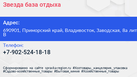 Звезда, база отдыха по адресу 690901, Приморский край, Владивосток, Заводская, 8а лит В в дальнейшем Организация, размещена в следующих категориях: