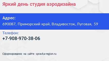 Яркий день, студия аэродизайна по адресу 690087, Приморский край, Владивосток, Луговая, 59 в дальнейшем Организация, размещена в следующих категориях: