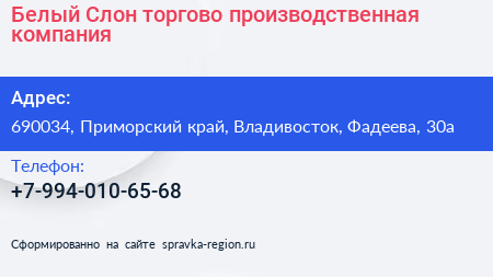 Белый Слон, торгово-производственная компания по адресу 690034, Приморский край, Владивосток, Фадеева, 30а в дальнейшем Организация, размещена в следующих категориях: