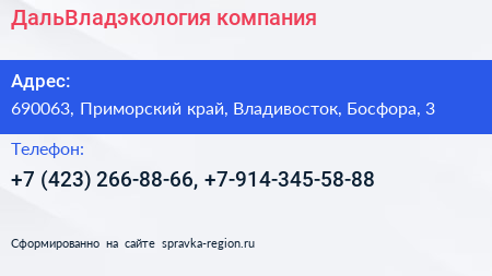 ДальВладэкология, компания по адресу 690063, Приморский край, Владивосток, Босфора, 3 в дальнейшем Организация, размещена в следующих категориях: