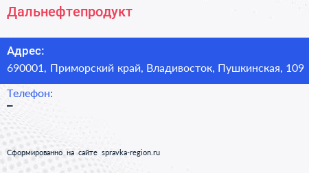 Дальнефтепродукт по адресу 690001, Приморский край, Владивосток, Пушкинская, 109 в дальнейшем Организация, размещена в следующих категориях: