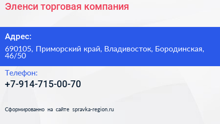 Эленси, торговая компания по адресу 690105, Приморский край, Владивосток, Бородинская, 46/50 в дальнейшем Организация, размещена в следующих категориях:
