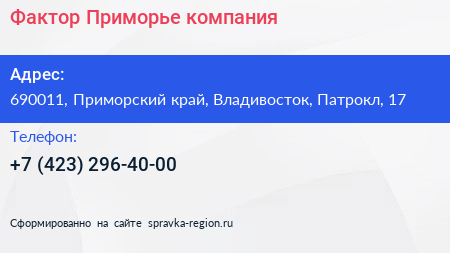 Фактор-Приморье, компания по адресу 690011, Приморский край, Владивосток, Патрокл, 17 в дальнейшем Организация, размещена в следующих категориях: