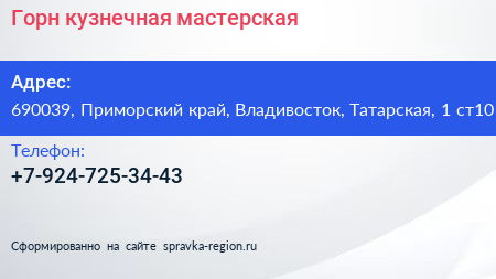 Горн, кузнечная мастерская по адресу 690039, Приморский край, Владивосток, Татарская, 1 ст10 в дальнейшем Организация, размещена в следующих категориях: