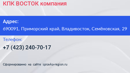 КПК ВОСТОК, компания по адресу 690091, Приморский край, Владивосток, Семёновская, 29 в дальнейшем Организация, размещена в следующих категориях:
