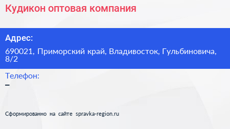 Кудикон, оптовая компания по адресу 690021, Приморский край, Владивосток, Гульбиновича, 8/2 в дальнейшем Организация, размещена в следующих категориях: