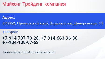 Майхонг Трейдинг, компания по адресу 690062, Приморский край, Владивосток, Днепровская, 44 в дальнейшем Организация, размещена в следующих категориях: