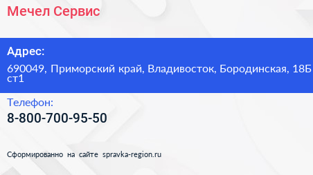 Мечел-Сервис по адресу 690049, Приморский край, Владивосток, Бородинская, 18Б ст1 в дальнейшем Организация, размещена в следующих категориях: