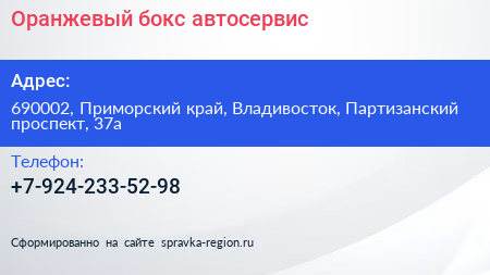 Оранжевый бокс, автосервис по адресу 690002, Приморский край, Владивосток, Партизанский проспект, 37а в дальнейшем Организация, размещена в следующих категориях: