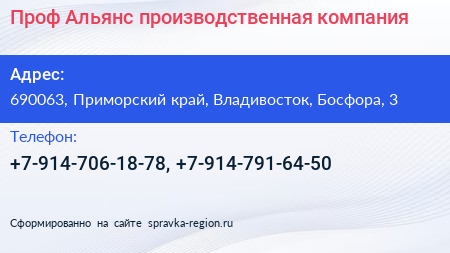 Проф-Альянс, производственная компания по адресу 690063, Приморский край, Владивосток, Босфора, 3 в дальнейшем Организация, размещена в следующих категориях: