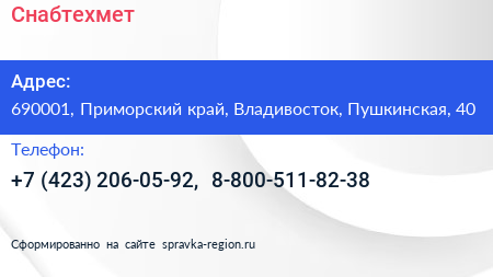 Снабтехмет по адресу 690001, Приморский край, Владивосток, Пушкинская, 40 в дальнейшем Организация, размещена в следующих категориях: