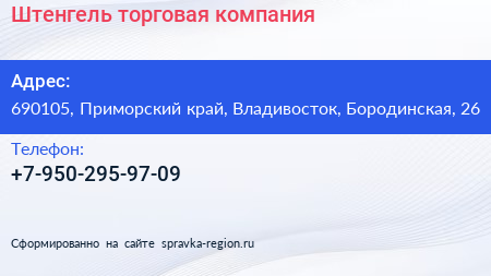 Штенгель, торговая компания по адресу 690105, Приморский край, Владивосток, Бородинская, 26 в дальнейшем Организация, размещена в следующих категориях: