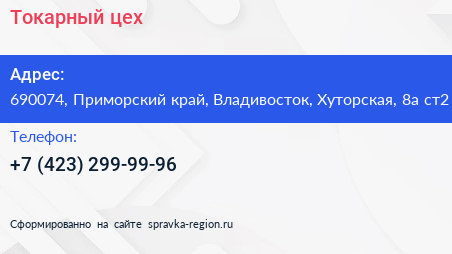 Токарный цех по адресу 690074, Приморский край, Владивосток, Хуторская, 8а ст2 в дальнейшем Организация, размещена в следующих категориях: