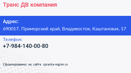 Транс ДВ, компания по адресу 690017, Приморский край, Владивосток, Каштановая, 17 в дальнейшем Организация, размещена в следующих категориях: