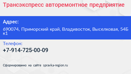 Трансэкспресс, авторемонтное предприятие по адресу 690074, Приморский край, Владивосток, Выселковая, 54Б к1 в дальнейшем Организация, размещена в следующих категориях:
