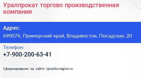Уралпрокат, торгово-производственная компания по адресу 690074, Приморский край, Владивосток, Посадская, 20 в дальнейшем Организация, размещена в следующих категориях: