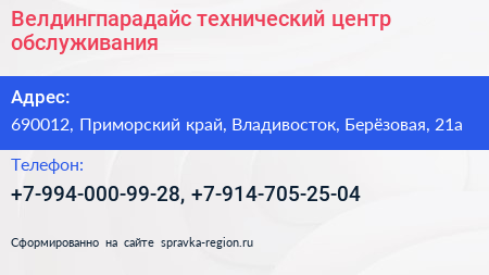 Велдингпарадайс, технический центр обслуживания по адресу 690012, Приморский край, Владивосток, Берёзовая, 21а в дальнейшем Организация, размещена в следующих категориях: