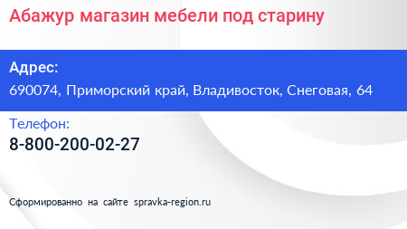 Абажур, магазин мебели под старину по адресу 690074, Приморский край, Владивосток, Снеговая, 64 в дальнейшем Организация, размещена в следующих категориях: