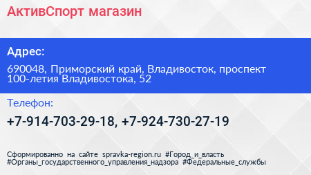 АктивСпорт, магазин по адресу 690048, Приморский край, Владивосток, проспект 100-летия Владивостока, 52 в дальнейшем Организация, размещена в следующих категориях: