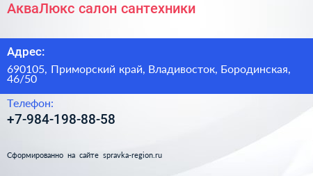 АкваЛюкс, салон сантехники по адресу 690105, Приморский край, Владивосток, Бородинская, 46/50 в дальнейшем Организация, размещена в следующих категориях:
