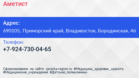 Аметист по адресу 690105, Приморский край, Владивосток, Бородинская, 46 в дальнейшем Организация, размещена в следующих категориях: