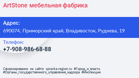 ArtStone, мебельная фабрика по адресу 690074, Приморский край, Владивосток, Руднева, 19 в дальнейшем Организация, размещена в следующих категориях: